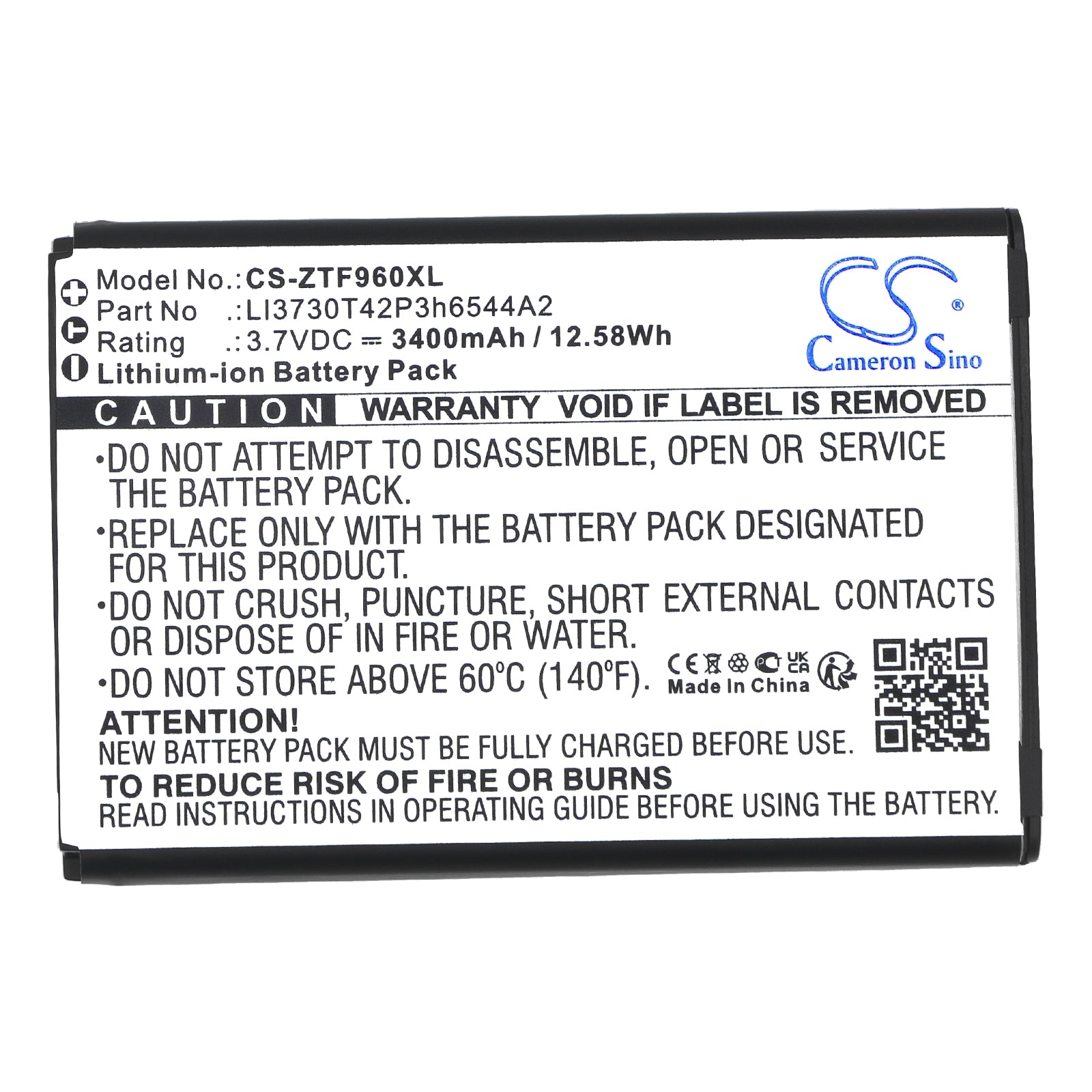 Volts: 3.7V, | Capacity: 3400mAh / 12.58Wh;Battery Type: Li-ion;Dimension: 65.00 x 44.00 x 10.20mm;