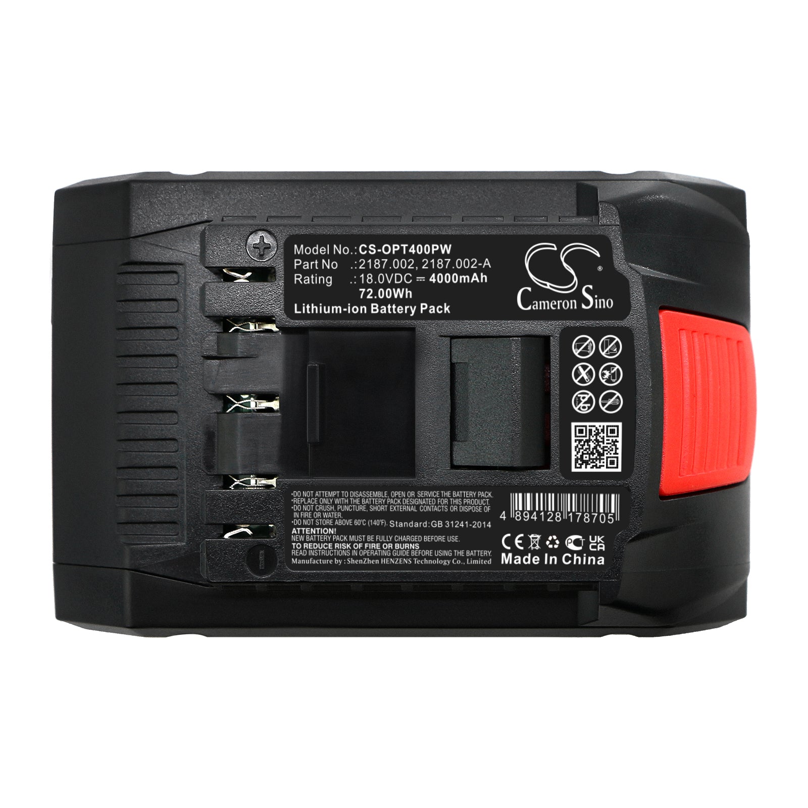Battery Specification:Volts: 18V, | Capacity: 4000mAh / 72.00Wh; Battery Type: Li-ion; Dimension: 118.00 x 76.60 x 51.80mm;
