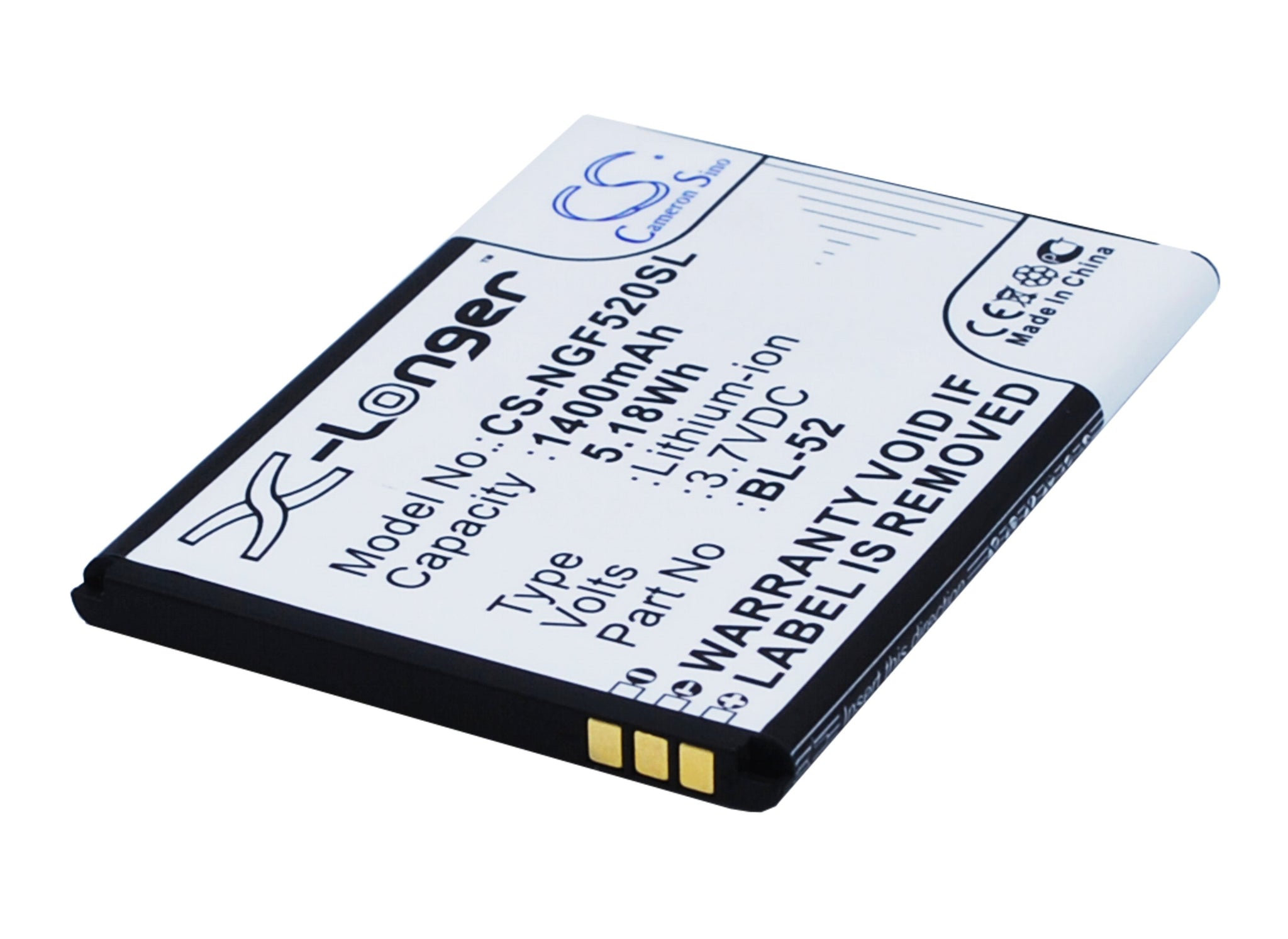 Volts: 3.7V, | Capacity: 1400mAh / 5.18Wh;Battery Type: Li-ion;Dimension: 65.05 x 48.05 x 4.30 mm;