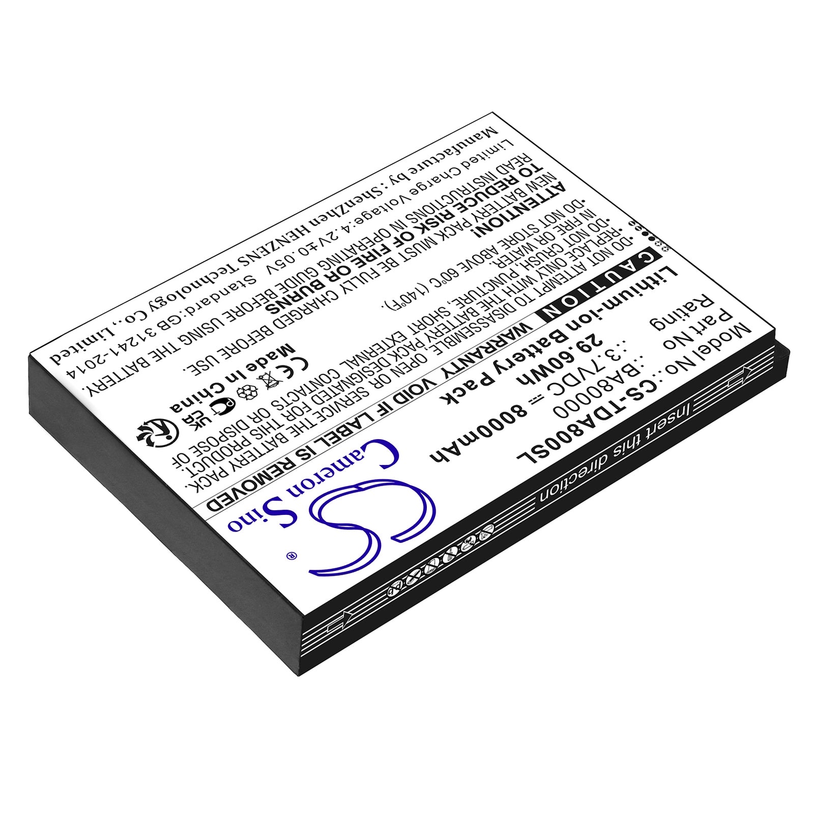 Volts: 3.7V, | Capacity: 8000mAh / 29.60Wh;Battery Type: Li-ion;Dimension: 102.00 x 69.30 x 13.40mm;