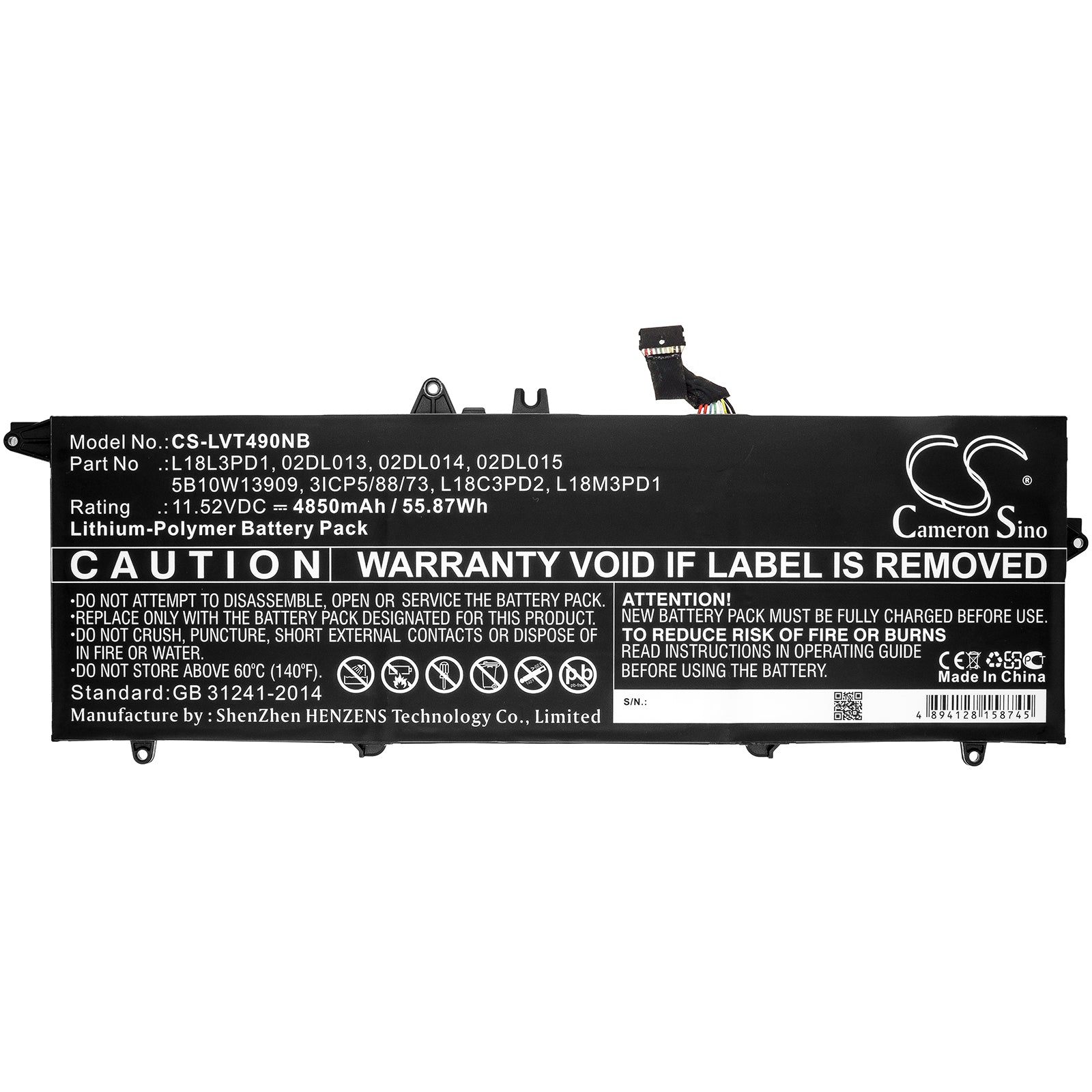 • Volts: 11.52V, | Capacity: 4850mAh / 55.87Wh;